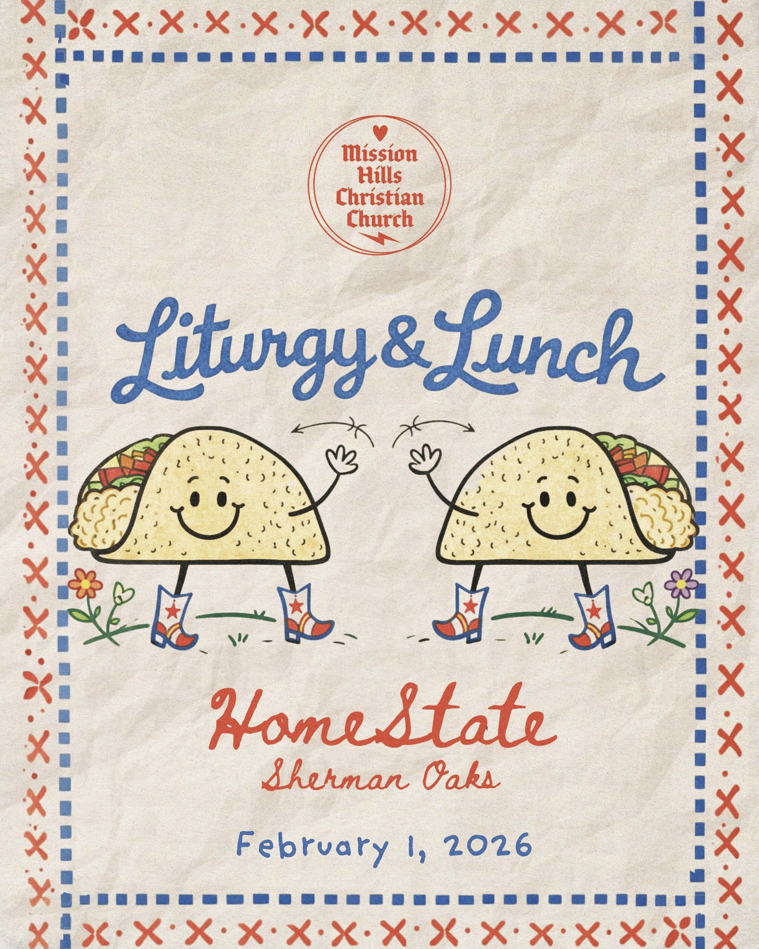 What to expect: We will get set up (look the Mission Hills banner), enjoy coffee and pastries, and have a service with music, reflections, and communion, followed by a baptism!